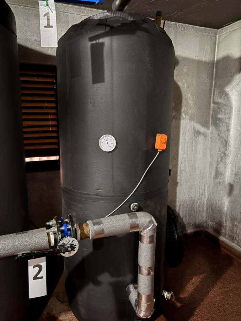 El nuevo acumulador, de fabricación nacional, cuenta con un revestimiento de acero de 8 mm de espesor, una tapa de registro de 45 cm y un ánodo de magnesio de 1 pulgada. Para minimizar la pérdida de calor, se ha instalado una manta elastomérica de 25 mm.